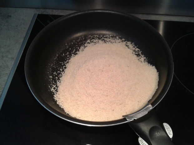 Tomar el polvo de la almendra y lo tostamos. Tenga cuidado, como el polvo no debe ser coloreado.