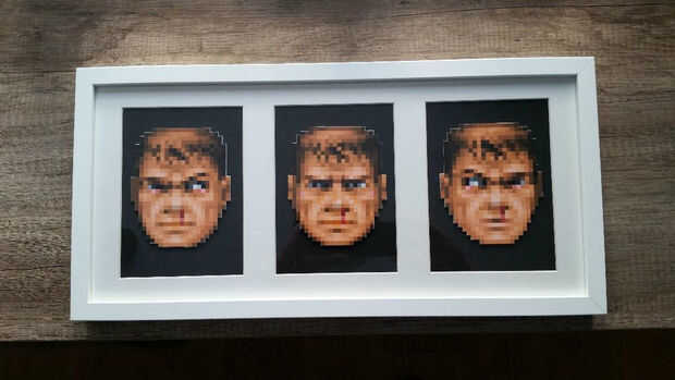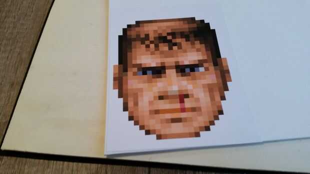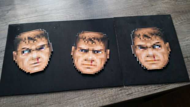 Primero imprimí las tres caras del Doomguy en inyección de tinta papel y había pegado sobre una hoja de goma espuma blanca. Después de esto se había secado, cuidadosamente corte a lo largo de los bordes de la impresión. Para obtener un efecto de 3D pegué las tres caras de goma espuma negra como base.