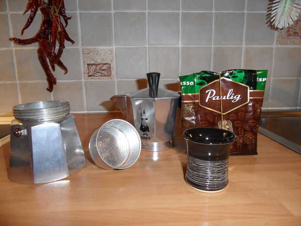 * Si tienes un molinillo de café, entonces yo prefiero sólo granos de café espresso y molerlos en casa a un molido muy fino, pero no llego a tener un molinillo de café así que voy a utilizar ya molido granos. Ambos funcionarán bien.