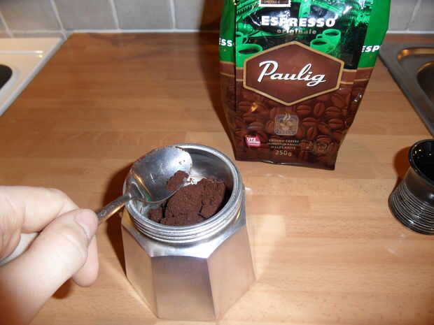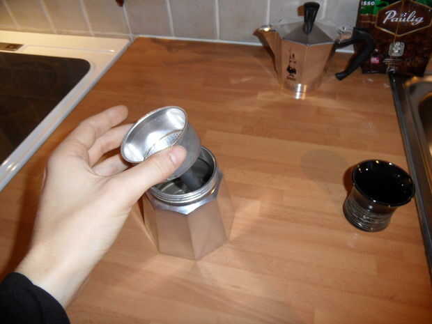 Al poner el filtro (embudo buscando cosa) en lugar como usted puede ver en las fotos. Luego sólo tendrás que poner allí el café molido. Para pote completo se llena de granos de café y poco más (las fotos serán buenas otra vez). Cuando hago dos tazas, generalmente pongo dos muy heeping cucharaditas de granos de café o algo así. Te llevarás bien con par de intentos. Y la cantidad puede variar en la marca de café que utiliza - algunos pueden probar mejor con poco rutinas más o menos.