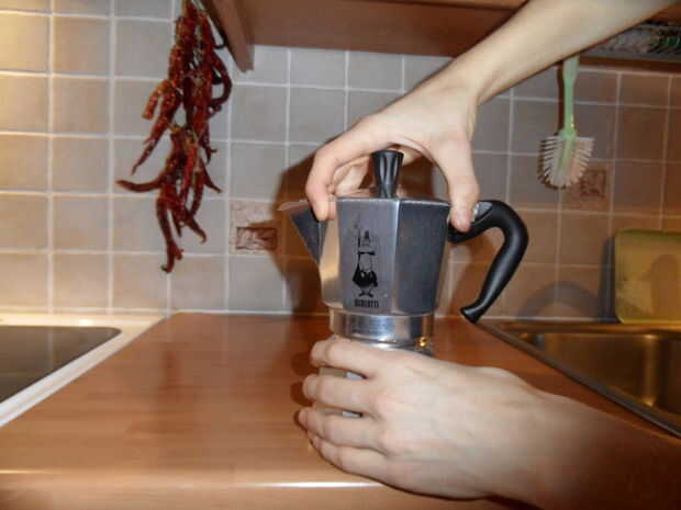 Entonces necesita enroscar la parte superior. Tornillo en bastante apretado, pero no tienes que torcer tanto como puedas, sólo así se mantiene bien y no se escaparán. Y antes de atornillar en, usted debe comprobar esta bien la Junta en la parte superior. Si no, usted debe comprar uno nuevo. Tienen esas juntas allí donde has comprado tu olla de moka. Esta parte es realmente el más fácil, pero yo sólo quería escribir más "Tornillo en la parte superior".