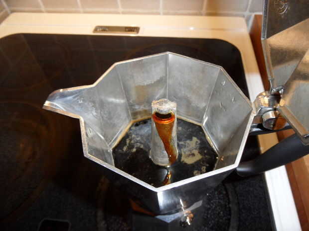 Usted no debería tener la tapa abierta como en mi segunda foto de abajo, porque el café puede arrojar a chorros a partir de ahí, y es caliente. Así que ten cuidado. Realmente cuando café empieza a subir, entonces (por mi experiencia) no squirt en todo, pero cuando se inicia el ruido más fuerte, puede y va a salir "violentamente". de todos modos, mantener la tapa cerrada no hará nada malo a usted - realmente no necesita ver, el sonido lo dice todo.