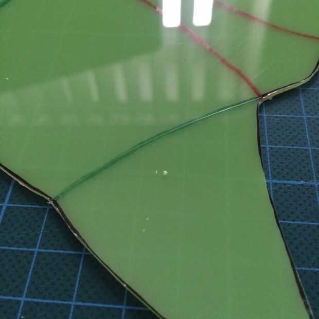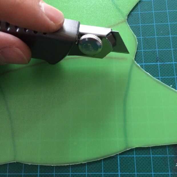 Para hacer las bisagras, hacer cortes de luz en las líneas verdes. Después de realizar este corte, la vuelta la hoja y hacer cortes ligeros sobre las líneas rojas.