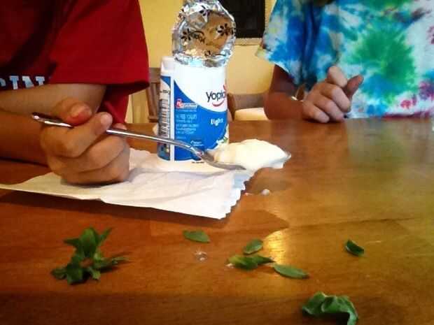 Puesto sobre 2 cucharadas de yogur la bolsa con las fresas. Mush en demasiado!