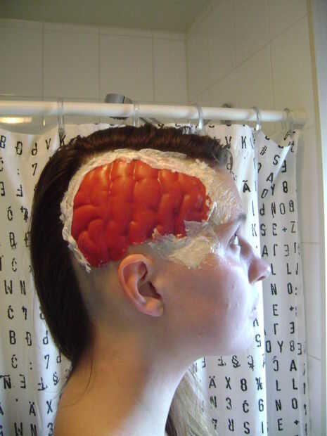 Aplicar el grado de traje latex líquido alrededor de los bordes del cerebro. Mientras que el látex es todavía pegajoso, cubrirla con las tiras rasgadas de papel higiénico. Esto será disimular los bordes del cerebro. Cubra el papel higiénico con látex más y deje que se seque.