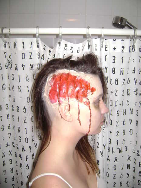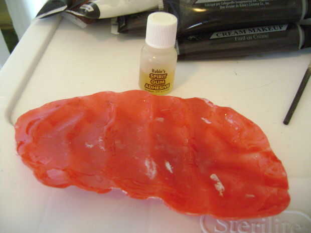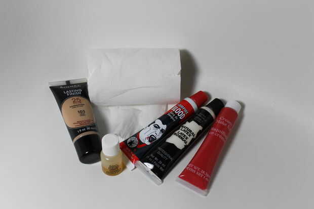 Pintura al látex y papel higiénico con corrector por lo que parece la piel. Cuidadosamente rasgón y la cáscara de nuevo algunos de los bordes para parecen a cuchilladas. Pintar el interior de las cuchilladas con pintura de cara roja.