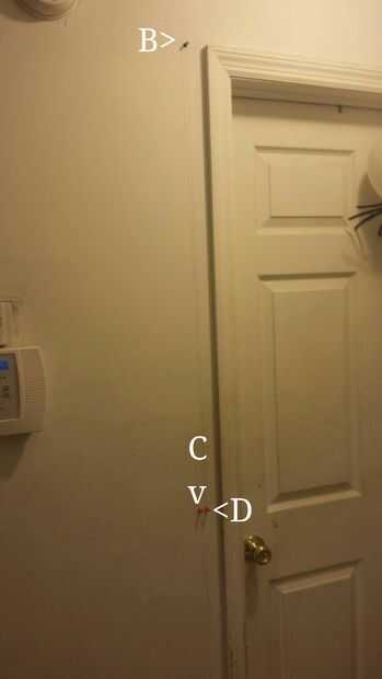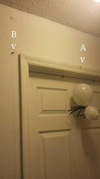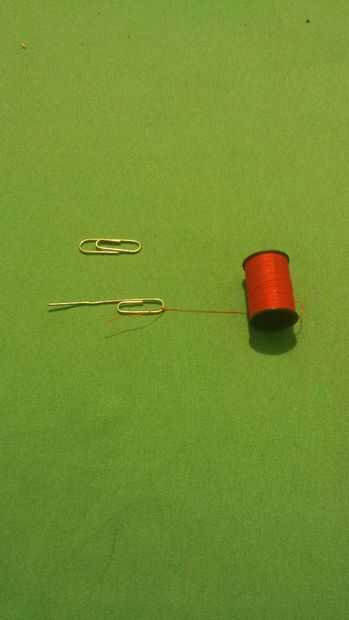 Para comenzar a conectar los puntos Coloque un poco de hilo de rosca a la araña a través de un trozo de cinta en las arañas detrás. Enhebre el hilo de la araña en la bordada en punto A. funcionamiento del hilo sobre la tachuela en el punto B y hacia abajo entre las tachuelas en los puntos C y D. permite el hilo para colgar y doblar el clip como en la foto. Fije un hilo hasta el final del bucle del clip de papel y el extremo del hilo, corriendo por el camino de la puerta, a la bordada en punto D.