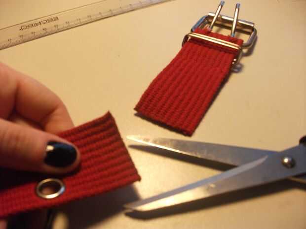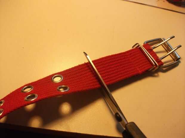Ahora prepare el otro lado de la correa. Dejo el mismo espacio entre el comienzo de la banda y los dos primeros agujeros, pero usted puede hacer lo contrario. Una vez que usted ha cortado quemadura al final como ya hizo en el otro lado.