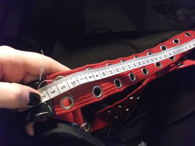 Tome una bolsa cuya correa es lo suficientemente largo como para usted. Medir su longitud. Ahora la cinta de medir y comparar ambas. En mi caso la correa no era lo suficientemente largos para hacer la cinta entera, así que necesitaba un pedazo de la antigua.