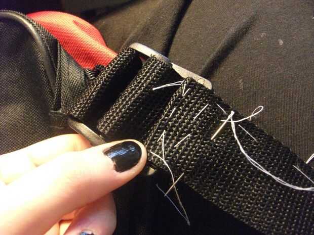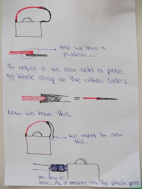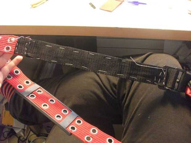 Luego cosí esta nueva pieza en el otro lado de la banda, manteniendo una pequeña sección dentro de las dos correas negro (ver imagen). Después de eso, cosido el otro extremo de la correa cerca de la pieza que ajusta la longitud de la correa (otra vez, por motivos de claridad, ver la foto y bosquejo).