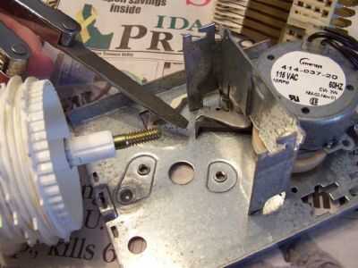 Dos patas que se celebrará para la rueda de plástico blanco con los pernos excéntricos y los dientes en se puedan introducir completamente en el marco de temporizador.  El archivo en mi herramienta Leatherman PST está apuntando a las patas.  Lo utilizado para sujetar las patas hacia atrás.