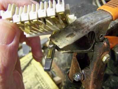 decidí probar una muy baja temperatura en mi hilo soldador para añadir un poco de soldadura material para el viejo contacto con sólo una corta ráfaga o dos.  Aviso que tengo un pequeño pedazo de acero a la parte posterior del brazo de contacto para llevar calor extra antes de que puede dañar el brazo de latón.  Sé que algunos artistas en metal soldadura piezas de cobre con soldadura de alambre en su soldadores de alambre de cobre.  No tengo ningún alambre de cobre para la soldadura, pero decidí hacer con acero, y funcionó bastante bien.