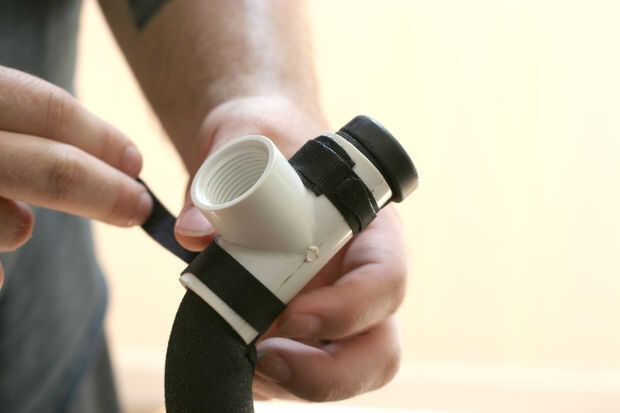 Tomar un par de los lazos del Velcro y envuelva alrededor de cada extremo de la t de complemento. Hacer que estos lo mas ajustado posible. No dude en pasar por alto el pequeño lazo que encontrarás en uno de los extremos de los lazos. Se rasgan hacia fuera tan pronto como se aplica cualquier tensión. Sólo envuélvalos tan estrecha como sea posible. Estos sostenga el tes de complemento en su lugar lo suficientemente bien como para permitir que usted incline la silla hacia atrás para superar bordillos y tal.