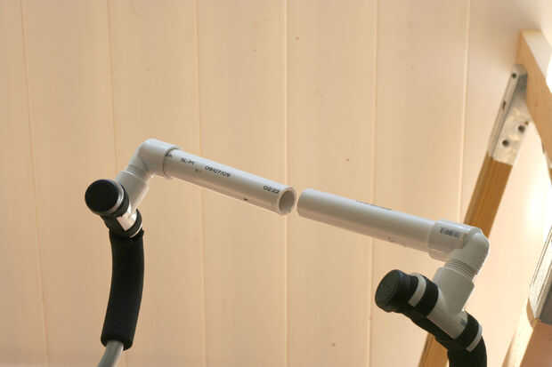 Esta asa comienza del mismo modo que la primera. Mida y corte una longitud de tubería entre los codos de la base. Solo usé el primer mango como una plantilla. Después de asegurarse el nuevo mango encaja correctamente, marque el centro de la tubería, longitud sabio. Usar la cinta métrica aquí y tratar de conseguir como cerca del centro como usted pueden. Esto hará más fácil manejo. Ahora, sostenga una camiseta hasta la marca. Hacer dos marcas en el tubo, una para cada lado de la t. Recuerde, una vez más, para tener en cuenta la cantidad que se reside dentro de la camiseta. Sierra de la pipa en las marcas para la t. El resultado final debe ser aproximadamente una pulgada en brecha entre las dos piezas de tubo cuando se inserta en los codos.