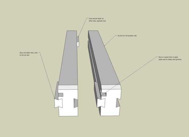 Pegar dos controles deslizantes en cada riel como se muestra en el diagrama. Un slider va debajo de la ranura de peg, y el otro es en el lado opuesto, otro extremo.