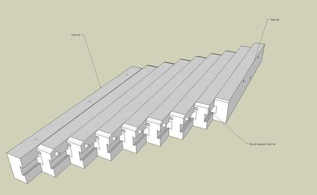 Se unen todos los rieles; crear dos conjuntos de siete. Prueba de ajuste. Asegúrese de que el conjunto se mueve suavemente.