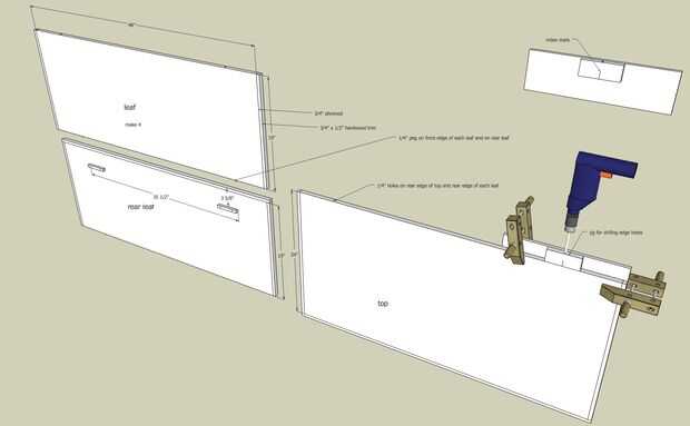 En este paso se crean el frente superior (conectado permanentemente a la mesa) y cinco hojas. Una hoja tiene una pieza de adorno en el extremo y éste se señala la hoja posterior.