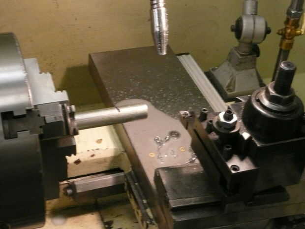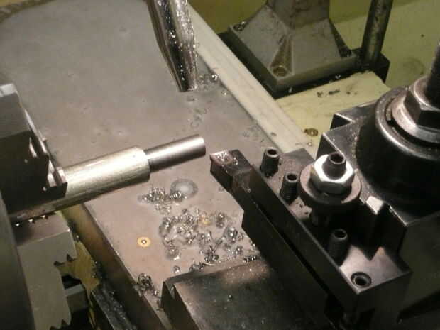 Inicio montando la acción en los tres quijada chuck en el torno de metal Jet y se enfrentan al final. Proceder a activar el diámetro a aproximadamente 45 pulgadas de diámetro X 1.25 pulgadas de largo. Portabrocas jacobs en que se utilizará esta extensión tiene una abertura máxima nominal.5 pulgadas y quiero mantener el extremo del eje tan grande como sea posible, así que giré el eje a 45 pulgadas de diámetro.