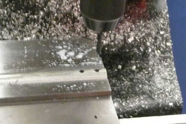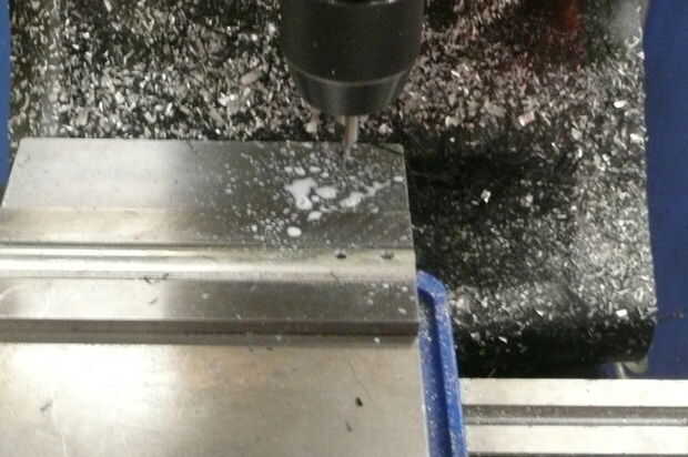 Pasar al molino de chorro y sujete la culata en la prensa utilizando paralles para localizar el stock proude sólo del vicio las mordazas. Después de localizar la línea central de la acción, centro taladro en.38 pulgadas desde el extremo y otra vez en 1,38 pulgadas. Reemplazar el taladro de centro con una broca #3, el taladro grifo para roscas de 1/4-28. Broca por el agujero del centro a los dos anteriormente centro lugares perforados.