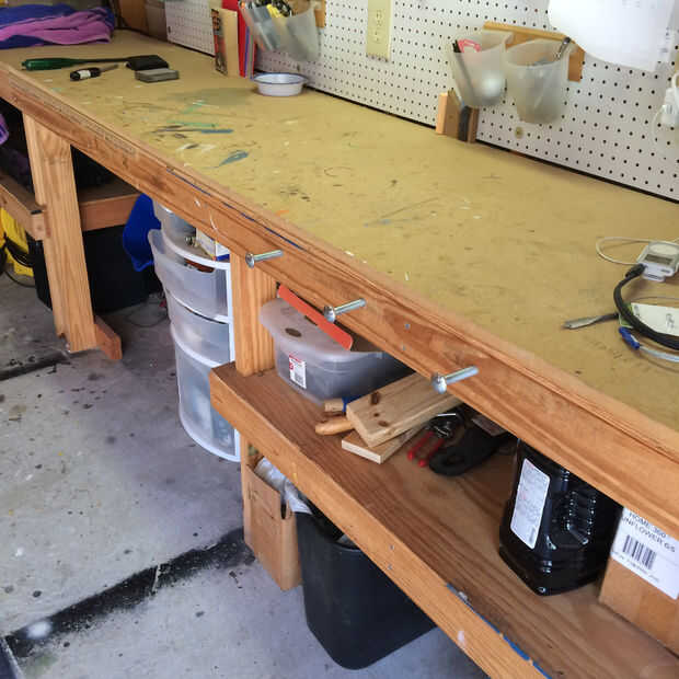 Dejando unas pocas pulgadas de holgura con la tuerca de mariposa puede sacar los tornillos para enganchar encima de la mesa y cuando haya terminado simplemente empuje los pernos contra el Banco de trabajo. Un cincel de madera, golpee ligeramente con un martillo, o tal vez un 9/16" bits puede ensanchar el agujero lo suficiente como para permitir que la Plaza del perno de carruaje a ceder en la madera.