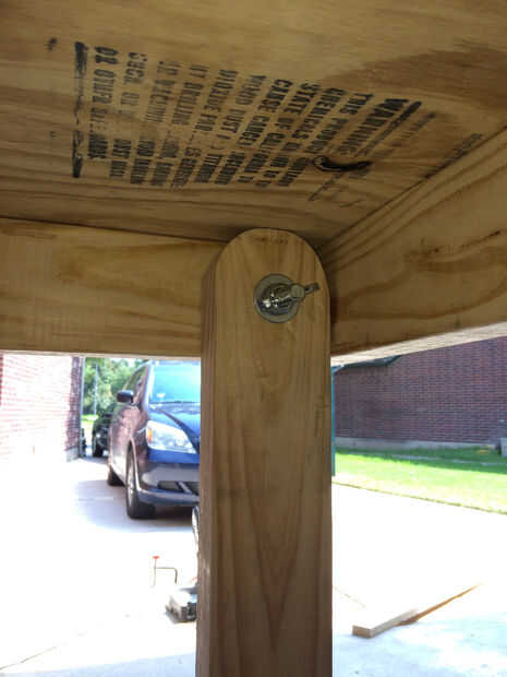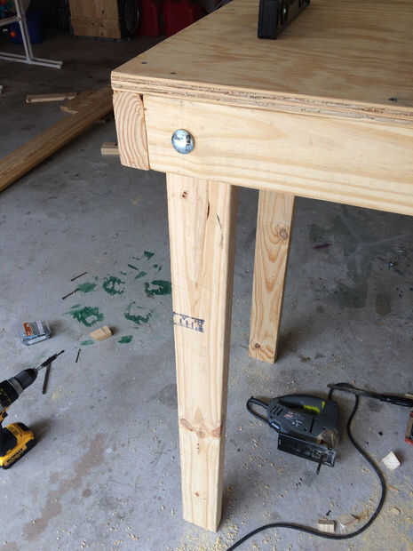 Había perforado a través del marco de 2 x 4 en la pierna y me aseguró con la 4.5" carruaje perno y tuerca de mariposa/fender arandela. Hacer esto para cada pierna.