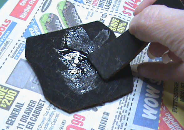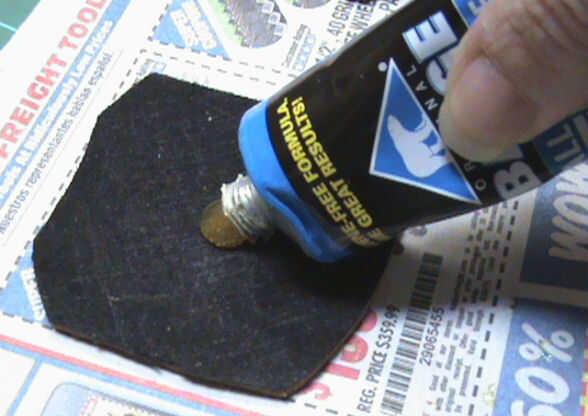 Ponga un tamaño de guisante de cemento de contacto en un lado de cada pieza de cuero y borrón de transferencia hacia los bordes. (Utiliza un pequeño trozo de cuero para extender el pegamento alrededor. Dejar que el cemento seque un poco (unos 5 minutos), entonces se alinean las piezas y presionan juntos. Hacer esto para todas las piezas hasta que construir un bloque de' o' cuero'.