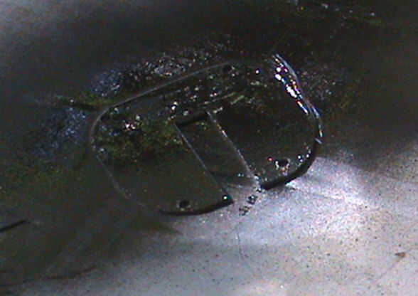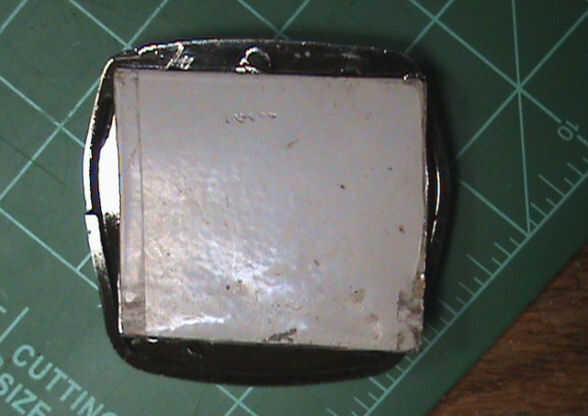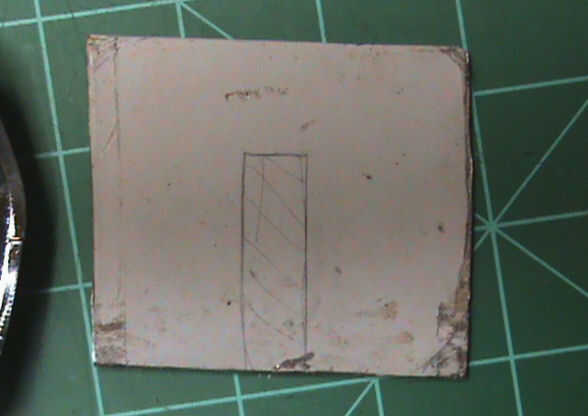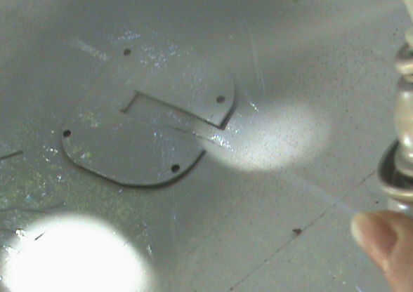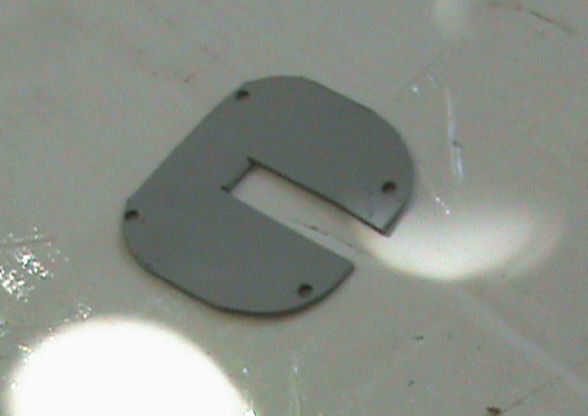 Usar otra vez la tapa de piloto como una plantilla para la chatarra. Marque la curva y los agujeros. Una ranura de aproximadamente 1/4" a 1/2" de ancho desde el fondo hasta aproximadamente 1/3 de la forma de la parte superior de la marca.