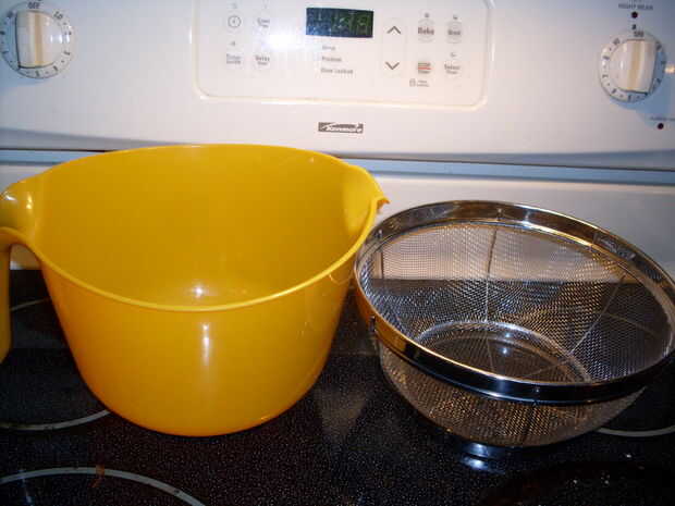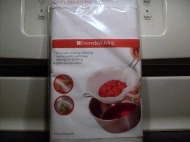 En términos de herramientas, basta con un colador, tazón de fuente que el colador se ajusta muy bien a y cañamazo. Encontré mi estopilla en Fred Meyer, vendido en un paquete en el área de utensilios cocina, vendido por unos $4.