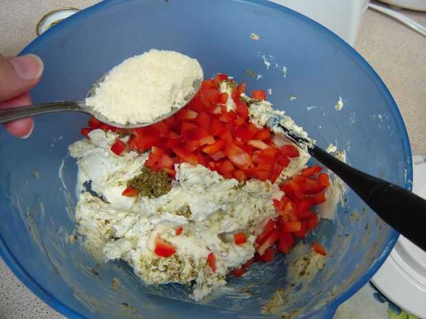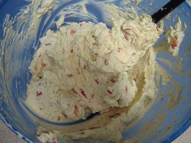 • colada y finalmente picar un pimiento rojo de tamaño mediano, añadir 3/4 de la misma a la crema de queso (guardar el resto para más tarde) *.