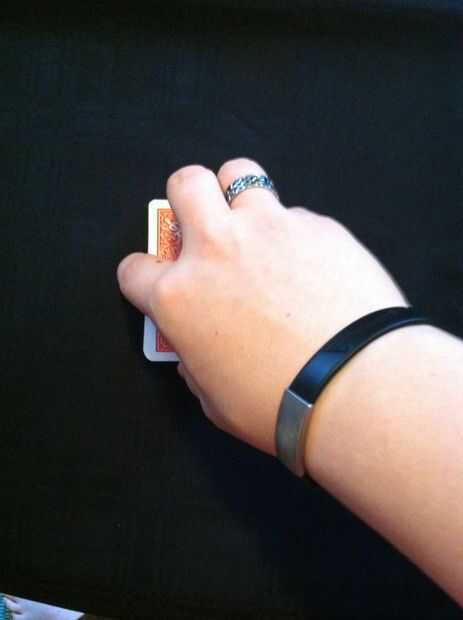 Esto es una mesa elegante. Es el más simple de los cuatro márgenes. Esto es bueno para trucos de magia en un entorno íntimo de la tabla. Pasos: 1. Sostenga la cubierta con el pulgar y el dedo medio en los extremos cortos. 2. Jale la cubierta hacia el lado, guiándola con el dedo índice.
