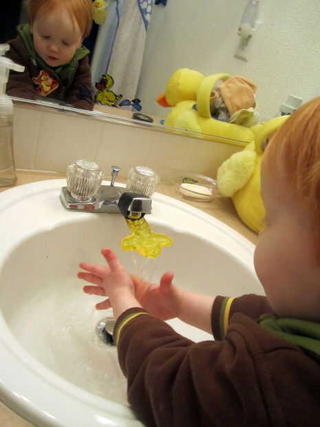 Problema secundario: él es demasiado corto para alcanzar el lavabo! Un banquito de Ikea sólo nos consiguió la mayoría de la forma: sus dedos apenas podrían llegar a la corriente de agua.