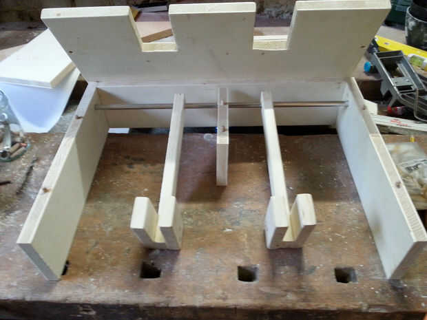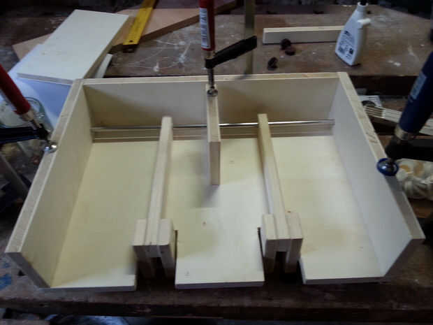 Ahora toma el tablero de la superficie y corte las cavidades para los pedales; Asegúrese de medir la posición de los pedales al menos dos veces a hacer las cosas bien. Con mi tamaño y los pedales, usé las cavidades profundas de 85mm y 56mm de ancho. Ahora Perfore orificios en la parte superior de los tableros laterales y tablero de soporte (véase la madera tapones en la primera foto) y usar alfileres para taladrar los agujeros correspondientes en el tablero de la superficie de la marca. "Pernos de la marca" se trata de pernos de metal con una aguja en la parte superior que tienen el mismo diámetro que conecta su madera: ponerlas en los agujeros, pulsa el tablero de la superficie donde debe ser, y usted encontrará las marcas para las posiciones de los orificios en el tablero de la superficie.
