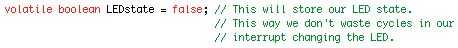 Pero interrumpe también puede complicar las cosas así! Debido a las interrupciones pueden ocurrir en cualquier momento y sin previo aviso, lo que significa que LEDstate puede cambiar en cualquier momento! Si tienes código que toma varios pasos a ejecutar, tienes que recordar que LEDstate podría cambiar entre cualquier paso dado y cuenta para eso.