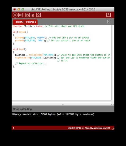 Revisa el código de ejemplo chipKIT_Polling. En este código, le pedimos el botón a bordo una y otra vez, nuestro LED a cualquiera que sea el botón es en la actualidad.