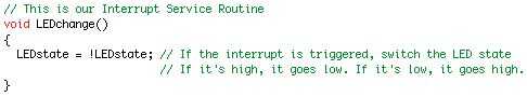 Como he mencionado en el paso anterior, establecemos nuestro servicio de interrumpir la rutina ISR a nuestra función de LEDchange(). Esta función puede ser todo lo que quieras, pero las interrupciones son cosas muy exigentes, por lo que hay un par de pautas que querrá seguir.