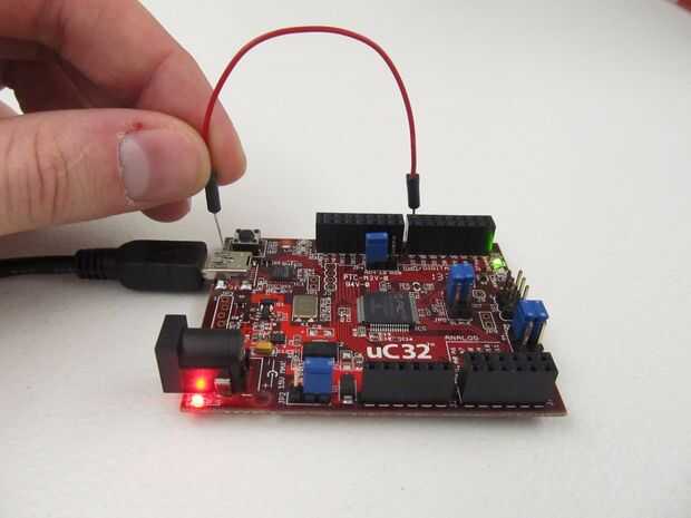 Ahora, con un cable conectado en el pin 7 en el uC32 o WF32, tocar el otro cable a tierra, se debe ver LED1 encienda y apague. Aseado! Pero ¿cómo funciona? Vamos a tirar aparte!