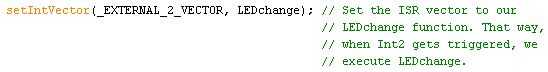 Si recuerdo en parte 1, parte de attachInterrupt() para especificar la función que queríamos ejecutar cuando tiene activa la interrupción. setIntVector() hace exactamente eso, pero es un poco diferente como se puede ver.