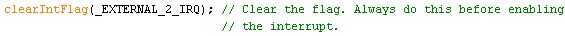 ¿Por último, observe cómo clearIntFlag() y setIntEnable() utilizan "_EXTERNAL_2_IRQ" en lugar de "_EXTERNAL_2_VECTOR"? Esto es porque se están haciendo referencia a diferentes lugares de la memoria. "IRQ" está parado para "Solicitud de Int", que es otra manera de referirse a la bandera de interrupción.