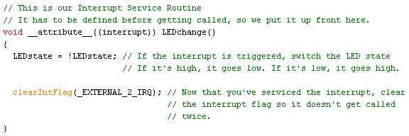 Por último, que absolutamente tiene que acordarse de usar clearIntFlat() al final de este ISR Normalmente, attachInterrupt() se encarga de limpiar la bandera después de que el ISR se ha ejecutado, pero estamos haciendo todo nosotros mismos con este código así que tenemos que borrar la bandera nosotros mismos así.
