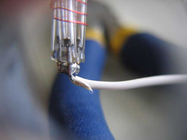 3. tomar un cable de conexión y corte en tiras que acomodar la longitud del cable del imán y cada uno a las masas de soldadura en los extremos de los tubos de destello de la soldadura.