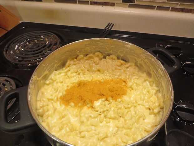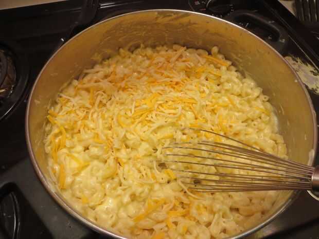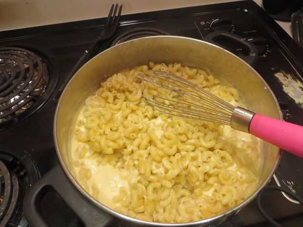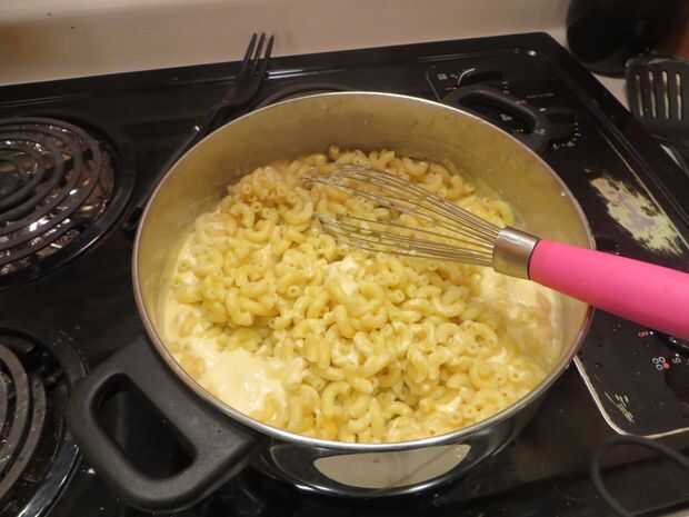 Lentamente vierta los fideos en la olla encima de la salsa de queso.