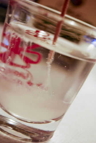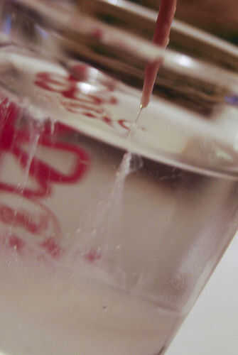 Una vez que crees que les tienes, lentamente puede levantar el toothpick de la solución. Debería verlo que se arrastra un delgado filamento de ADN. (revisa la segunda foto, tenga en cuenta que mi vaso de chupito tiene un logo de yelp rojo)