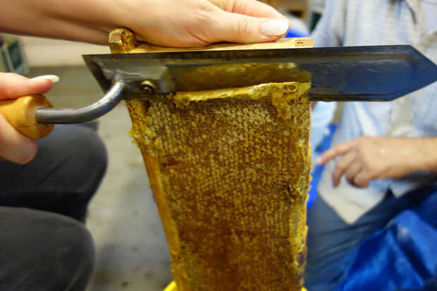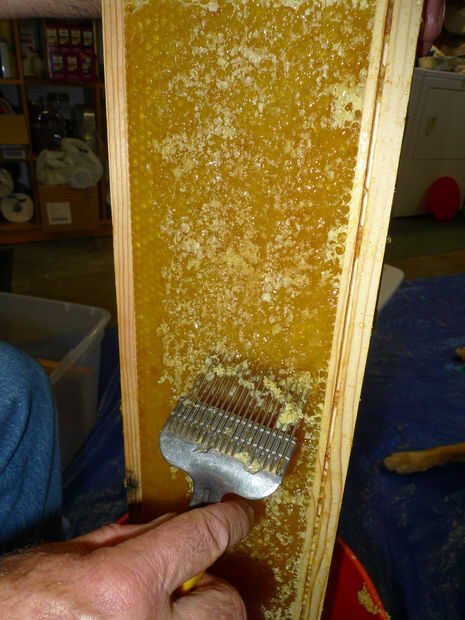 Abejas preservar la miel al tapado en las células de la cera. Para extraer la miel, es necesario retirar las tapas de las celdas, o tapas. La mayoría los marcos tienen miel en ambos lados, por lo que cada lado necesita estar destapado. Las fotos muestran Marcos destapados guardados en recipiente listo para ser destapado. Luego destapar con el cuchillo caliente. A continuación el rascador de la tapa se utiliza para seleccionar las células que no se han abierto.  La última foto es un marco destapado listo para entrar en el extractor.