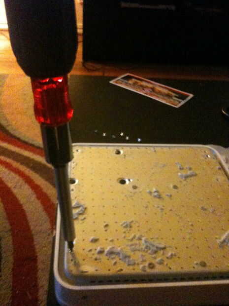 Después de bajar el pie, retirar todos los tornillos, asegúrese de obtener los oculta bajo la cola. Si es difícil en absoluto eliminar la hoja de metal entonces usted no ha conseguido todos los tornillos. Una vez hayas conseguido todos los tornillos, ten cuidado de no ajustar el cable que conecta los dos lados.
