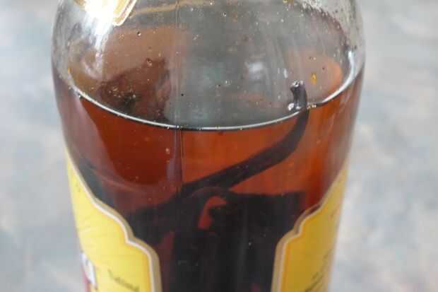este saborizante requiere dos ingredientes y tiempo. Usar una mitad galón bourbon. Abrir botella y añada 4 a 6 alta calidad Madagascar o frijoles de vainilla tahitianas. Sellar el frasco con la tapa que viene con la botella. Puse la botella fuera
