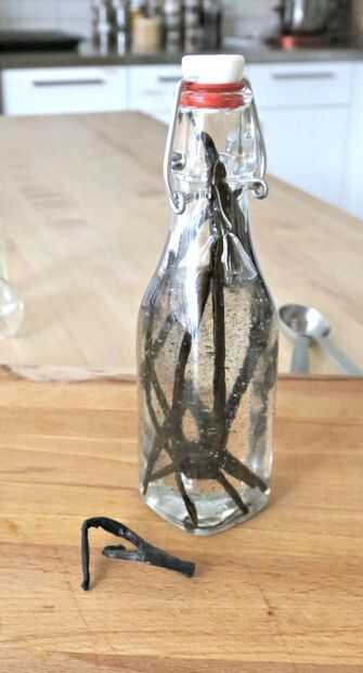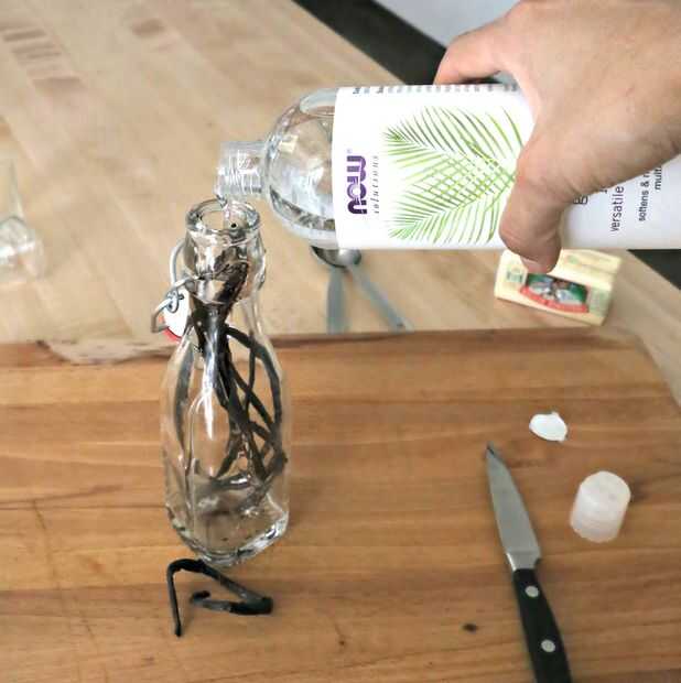 Extracto de vainilla casero1 limpia lunas alto botella de 8 onzas de vodka, Ron o bourbon o 8 onzas 100% puro 1 de glicerina vegetal. Cortar la vainilla longitudinalmente con un cuchillo o tijeras 2. Utilice un embudo para llenar la botella con alcoh