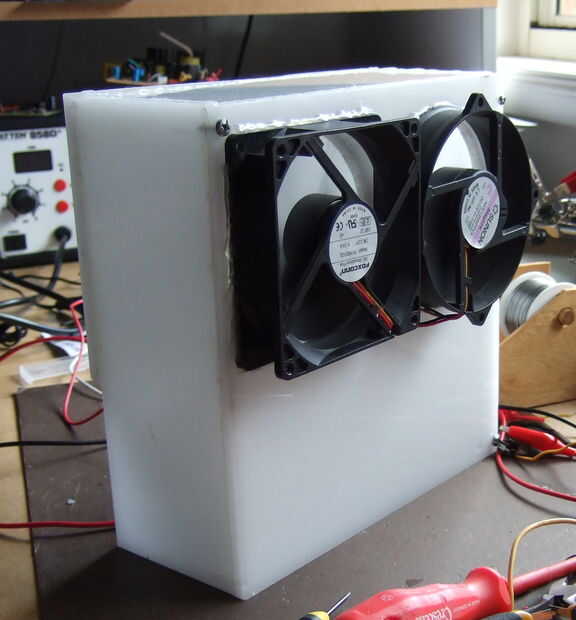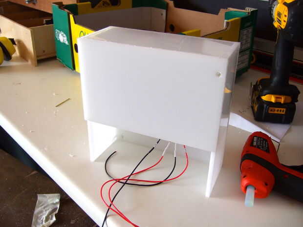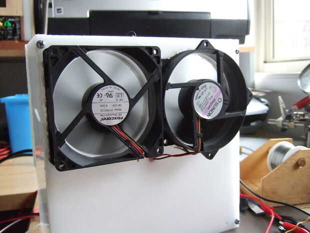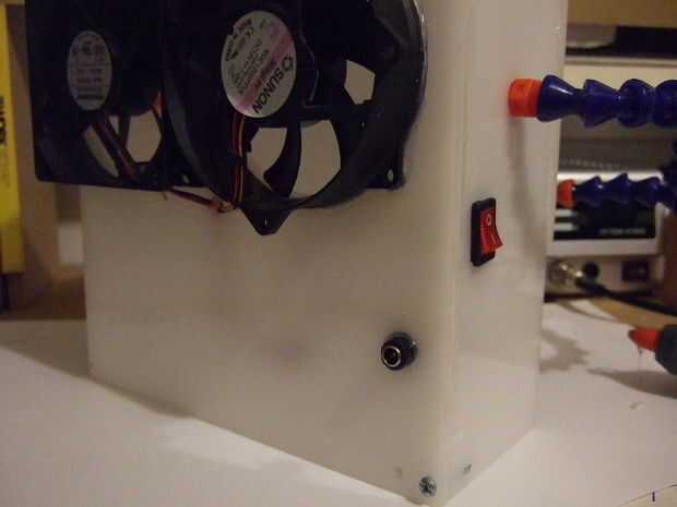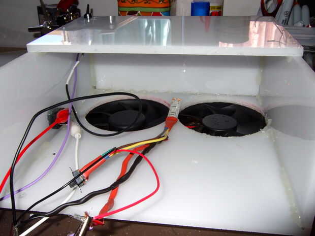 Pegamento caliente todas las piezas juntas, después de cortar los agujeros para los ventiladores.