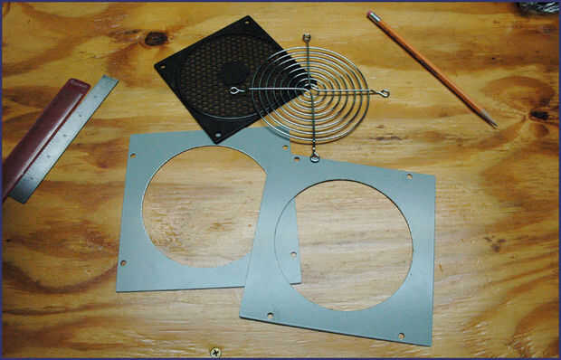 Orificio de 4.5" en el centro de cada tapa y taladrar los agujeros de la parrilla y el ventilador