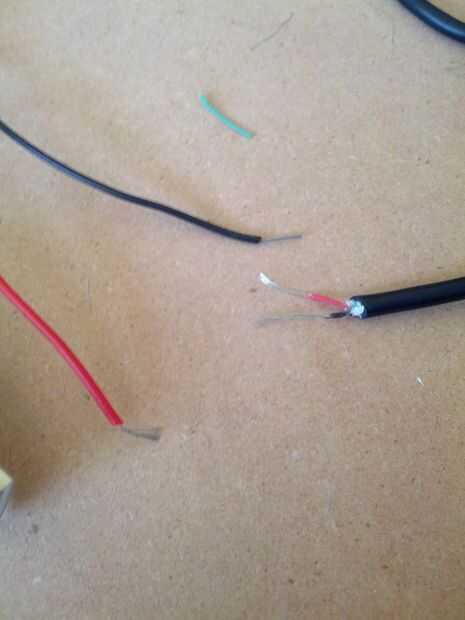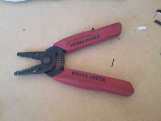 Cuidadosamente Quite la parte superior la capa externa de la cuerda del USB y cortar todo no rojo o negro. El cable USB rojo puede ser despojado con los strippers de Klein mango rojo. Es para cable de calibre más pequeño (o algo similar). Pero el cable negro es demasiado pequeño tan cuidadosamente pequeños cortes en el cable en la parte inferior de donde va a lo de la tira y luego simplemente tire de ella con la mano. Es fácil de cortar por la mitad por lo que si solo recortas todo y empezar de nuevo. No es gran cosa.