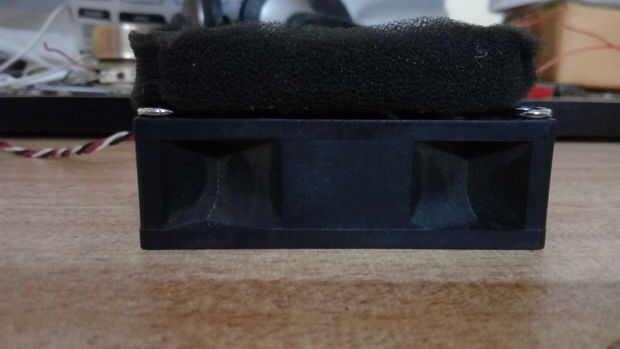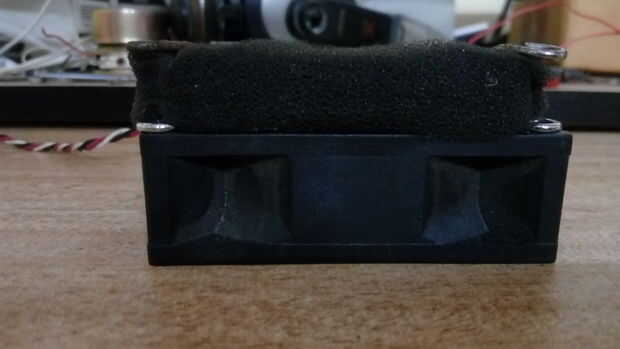 7) Apriete para arriba ambos ventiladores, parrillas y espuma con tornillos y tuercas. Apretado tornillos y tuercas lo suficiente como para sostener ambos ventiladores, parrillas y espuma juntos. Asegúrese de que usted comprime espuma no muy fuerte.